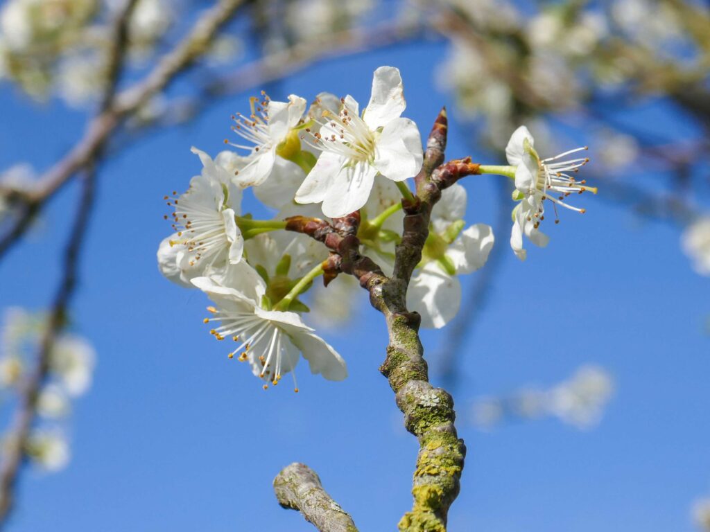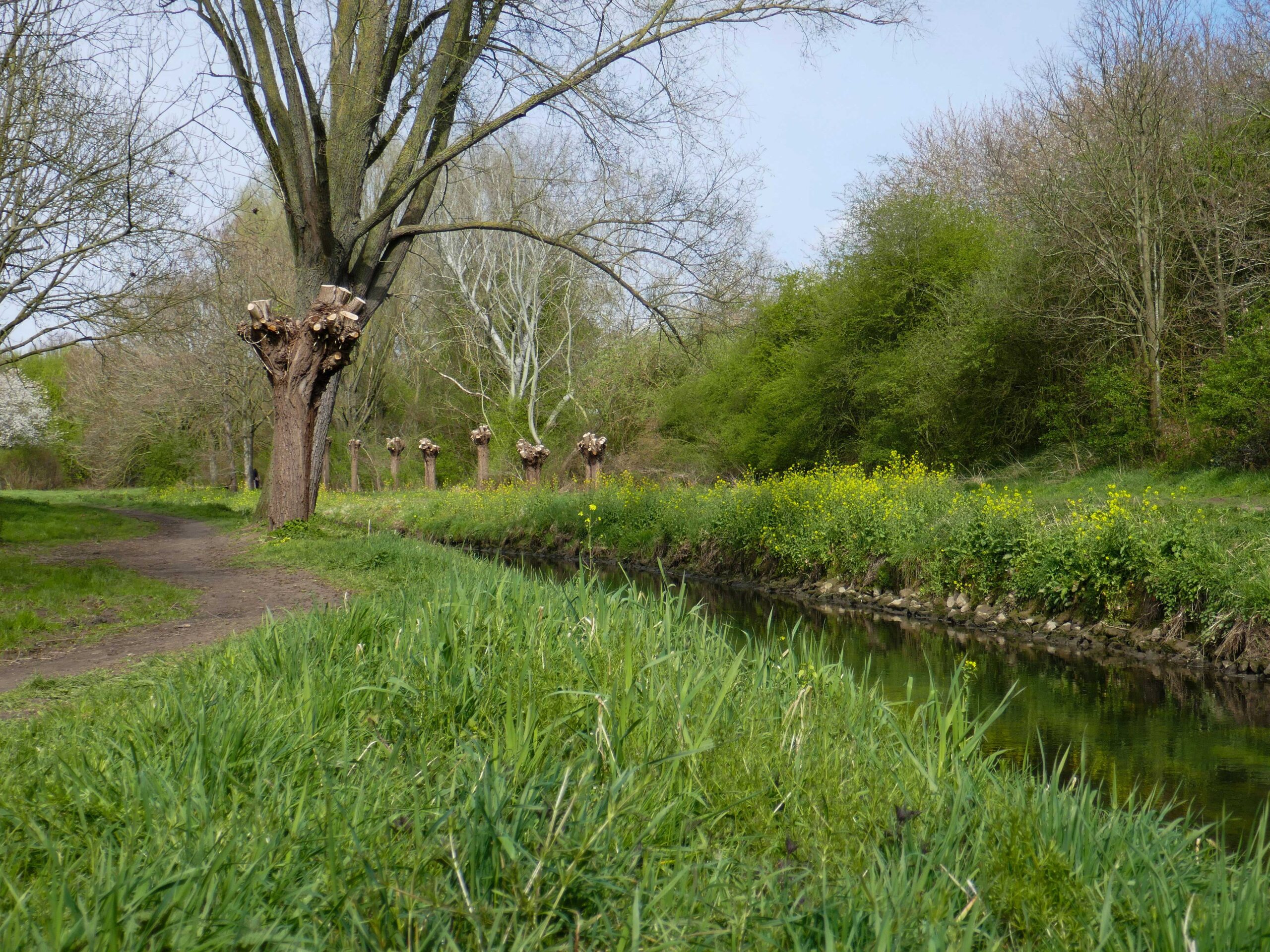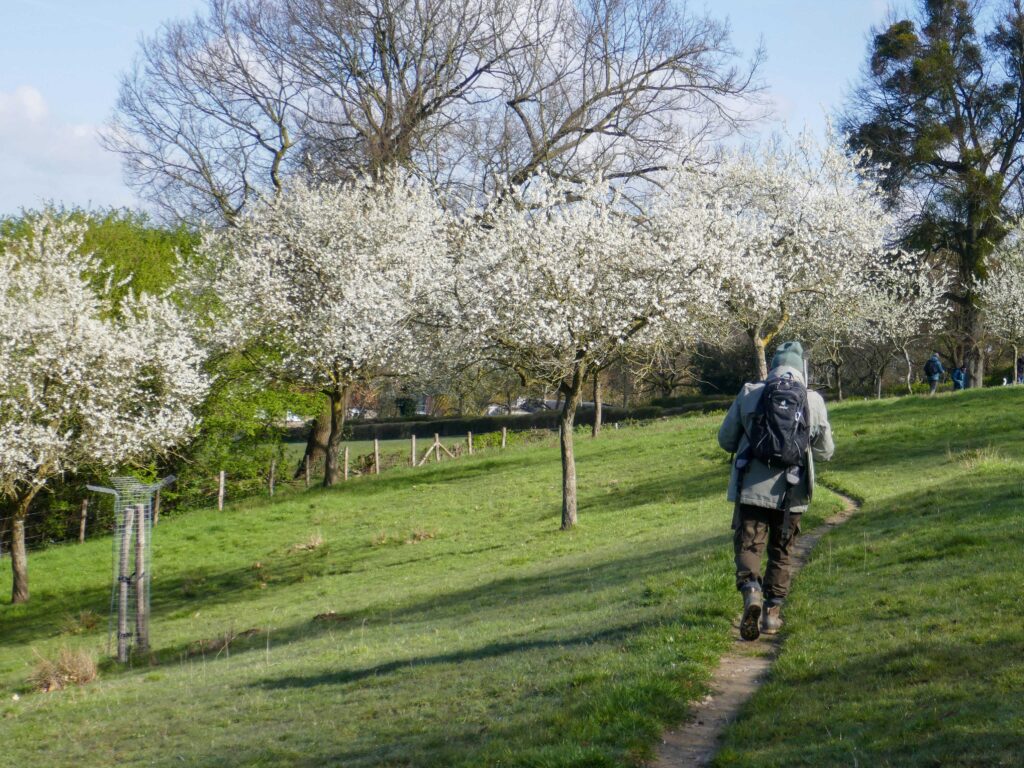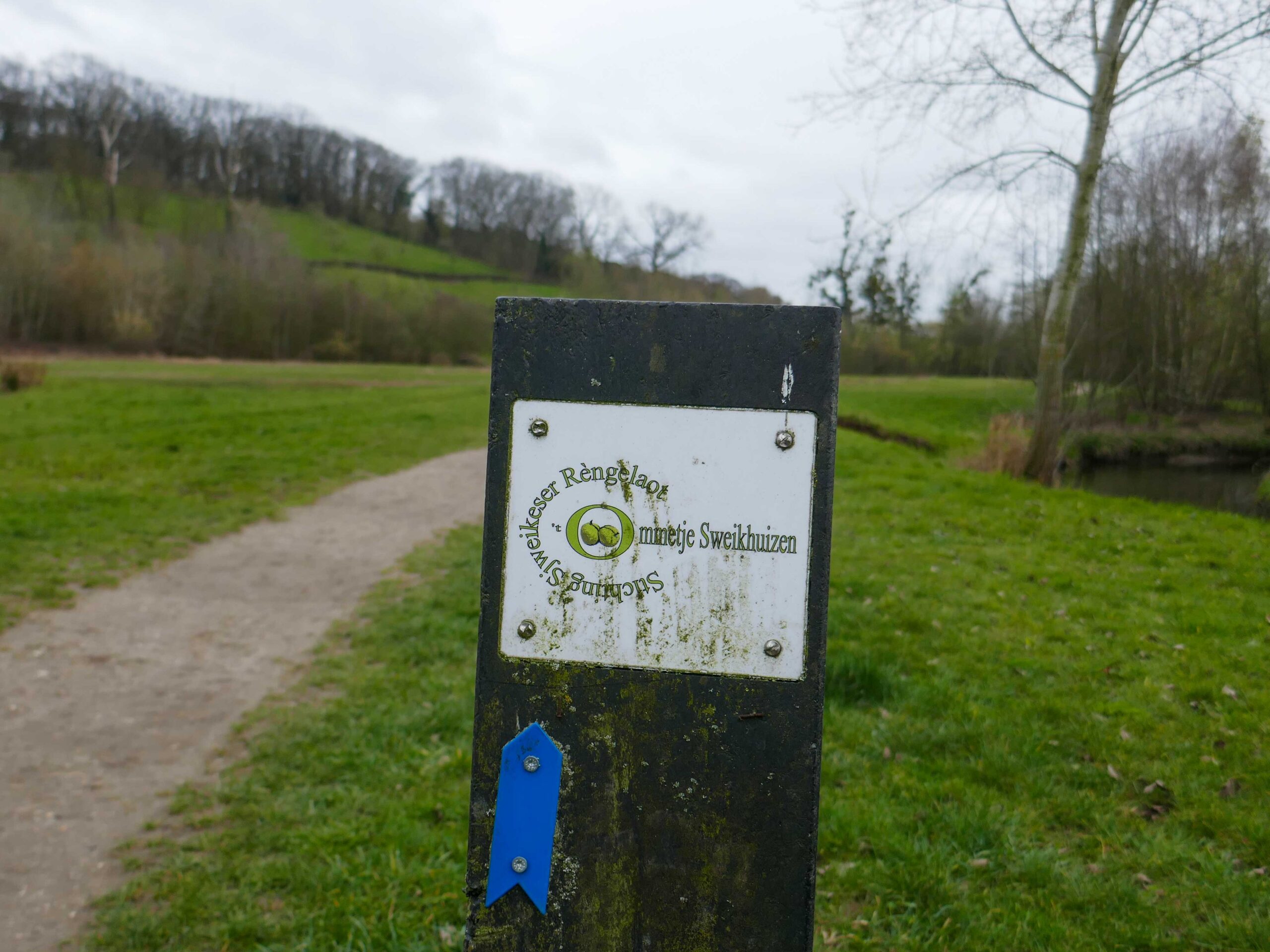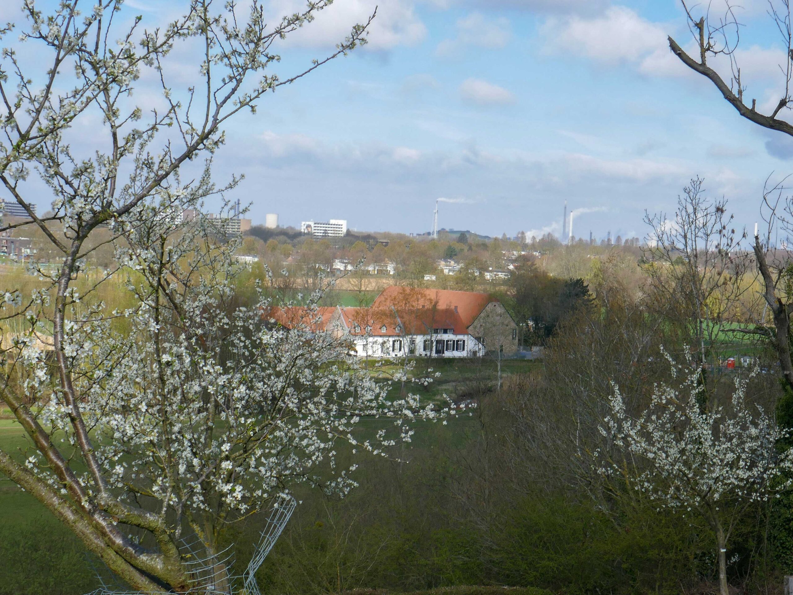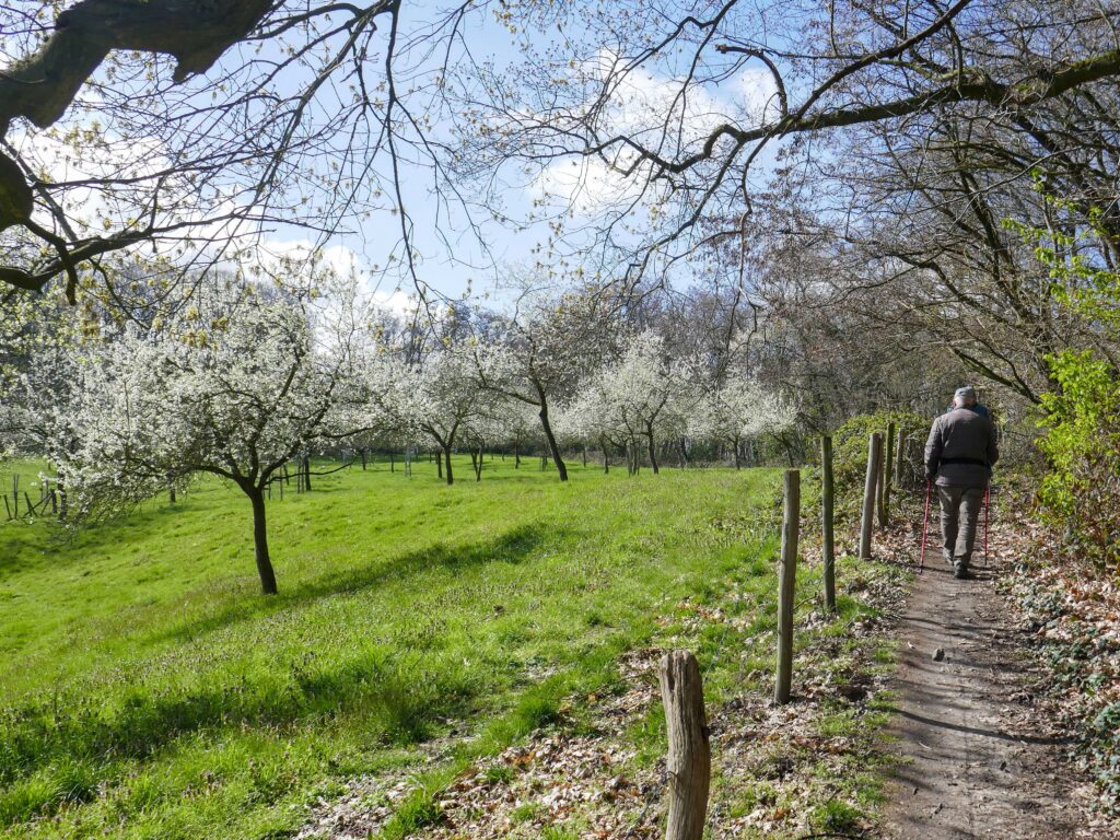 Ongelooflijk wat een mooi gebied verstopt tussen de bebouwing en industrie. We parkeren bij de parkeerplaats van de Biesenhof en beginnen aan onze wandelroute. Achter de oude hoeve slaan we rechtsaf en volgen het pad langs de Geleenbeek. Aan onze linkerhand zien we de rand van het Stammerbos. Het valt meteen op dat de pruimenbomen vol staan met bloesem, wat het landschap een bijzondere sfeer geeft. Na het passeren van de St. Jansmolen gaan we omhoog en slaan direct linksaf een stevige heuvel op. We wandelen de weilanden in, waar de velden prachtig gekleurd zijn en een witte waas hangt boven de stammen van de bloeiende pruimenbomen. Het uitzicht is adembenemend, vooral in het heuvelachtige gebied onder een helderblauwe lucht met vers groen gras.