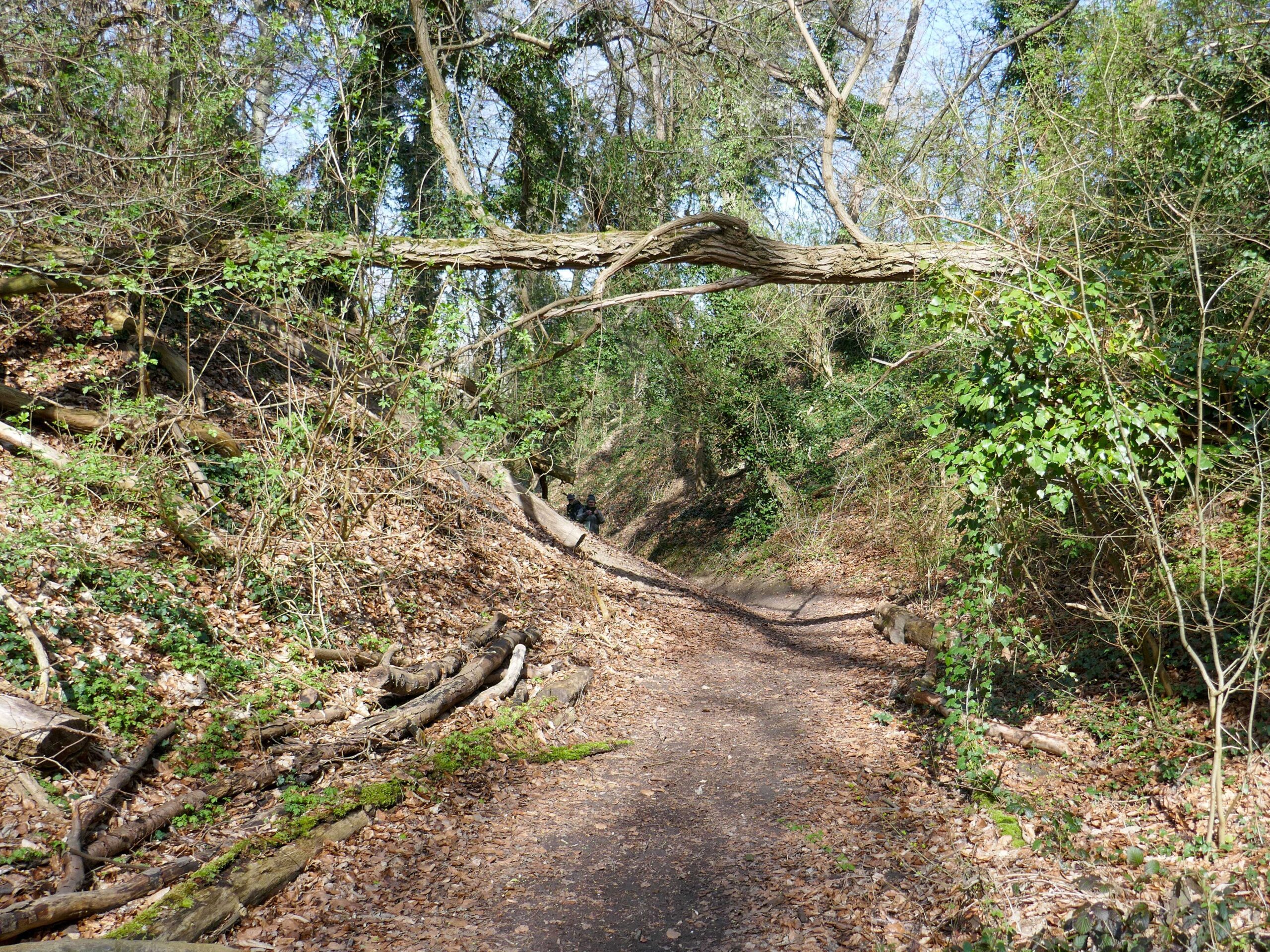 De route leidt ons door een prachtige holle weg naar Daniken, langs de oude steenfabriek. De schoorsteen staat al jaren scheef. Aan de voorzijde van het gebouw, langs de rand van het water, bloeien zomerklokjes. Vanaf hier wandelen we richting de Geleenbeek.