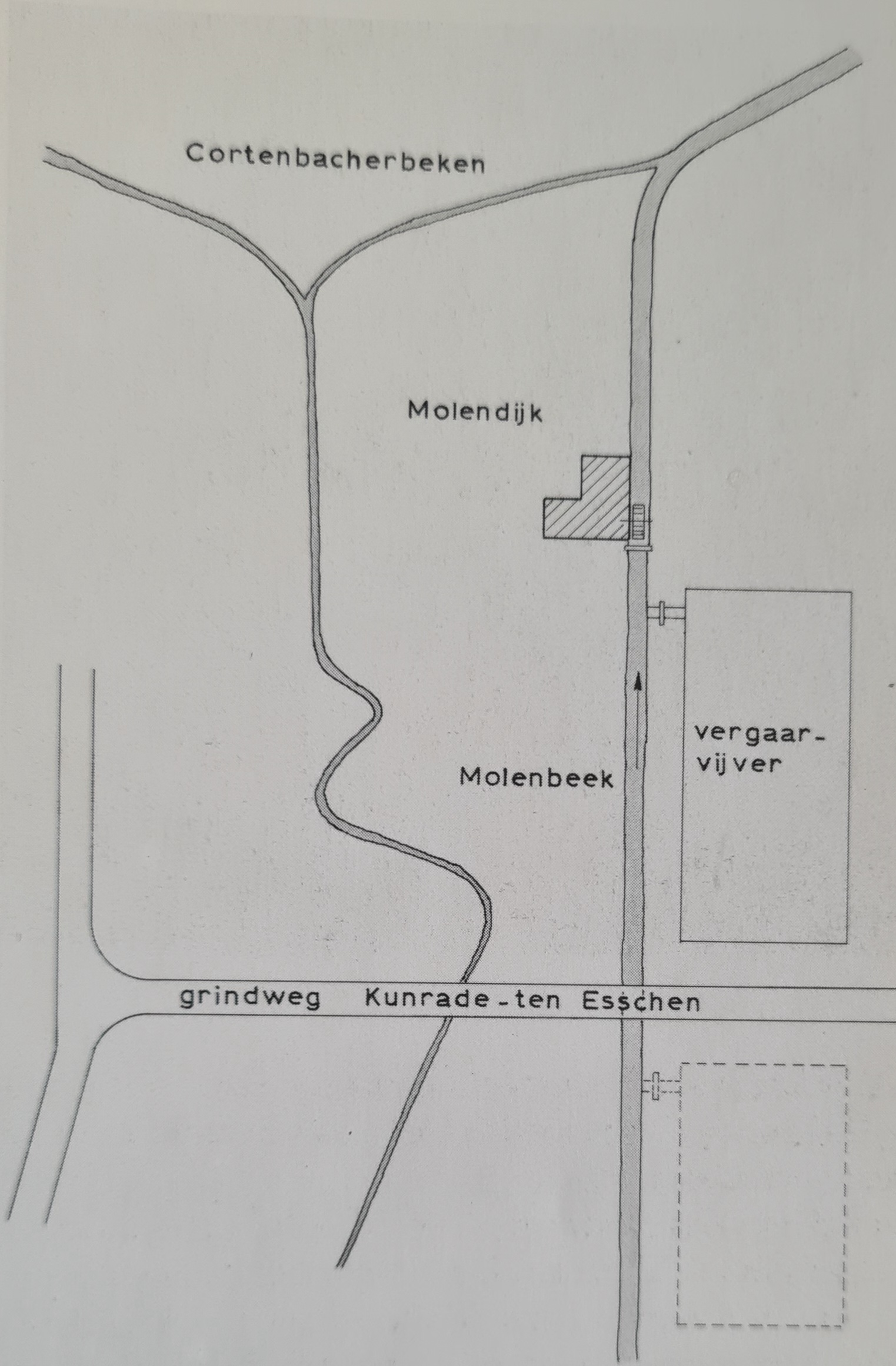 De huidige weg had vroeger een ander tracé. In die weg lag een fraai wit geschilderd bruggetje over de Voerendaalse Molenbeek. Het waterrad hing langs de muur aan de voorzijde van de langer rechtervleugel, waarlangs ook de beek stroomde (RAL, APW, WM) Links van de beek liep de molenweg en aan de rechterzijde lag de molen -of de vergaarvijver, die door een dam van de beek was gescheiden. Via een sluisje stonden beek en vijver met elkaar in verbinding. In het begin van de eeuw lagen er twee vijvers. Aan het boveneinde lag een afslagbeek om het overtollige water beneden het waterrad te kunnen afvoeren naar de Geleenbeek die achter de molen liep ( hongerbeek/ Cortenbacher beken en daarna de Geleen beek in )Aanvankelijk was de molen voorzien van een middenslagrad.