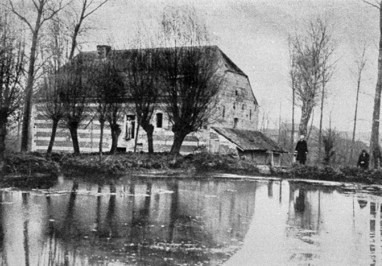 originele foto: Je ziet de molenaar in de deuropening staan. Foto gemaakt over de vergaarvijver heen je ziet op re de achtergrond Hoeve Steenenis